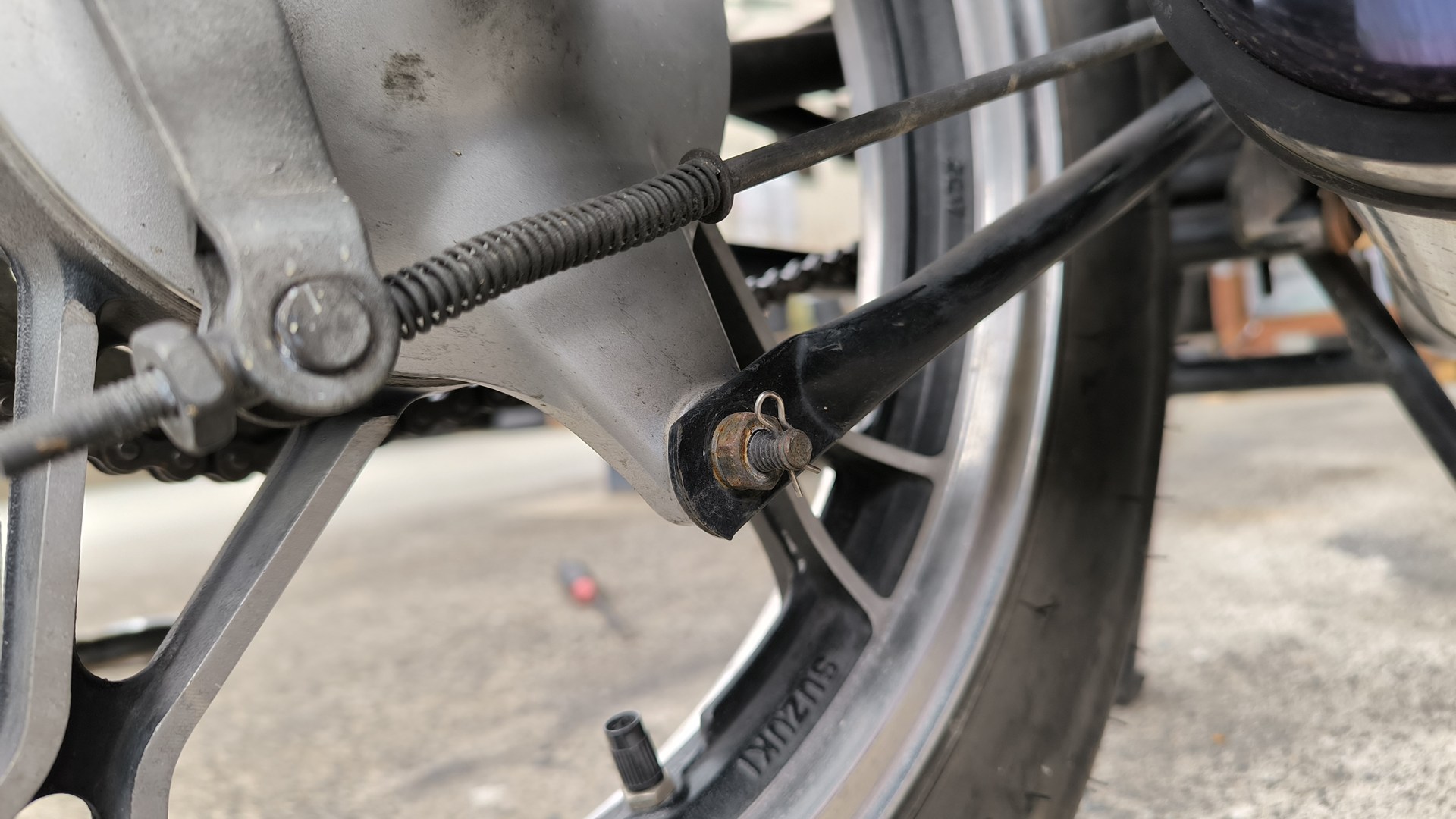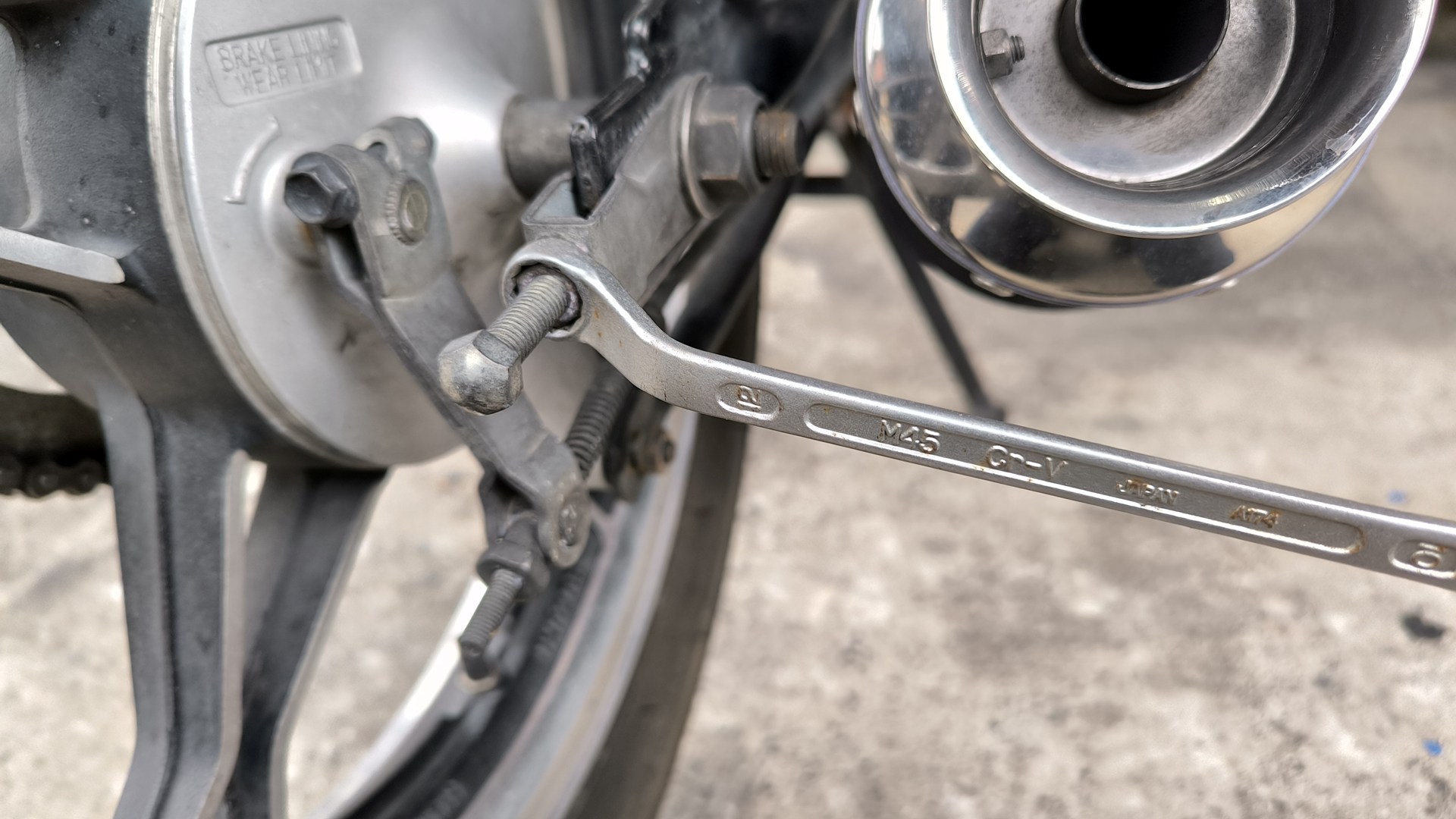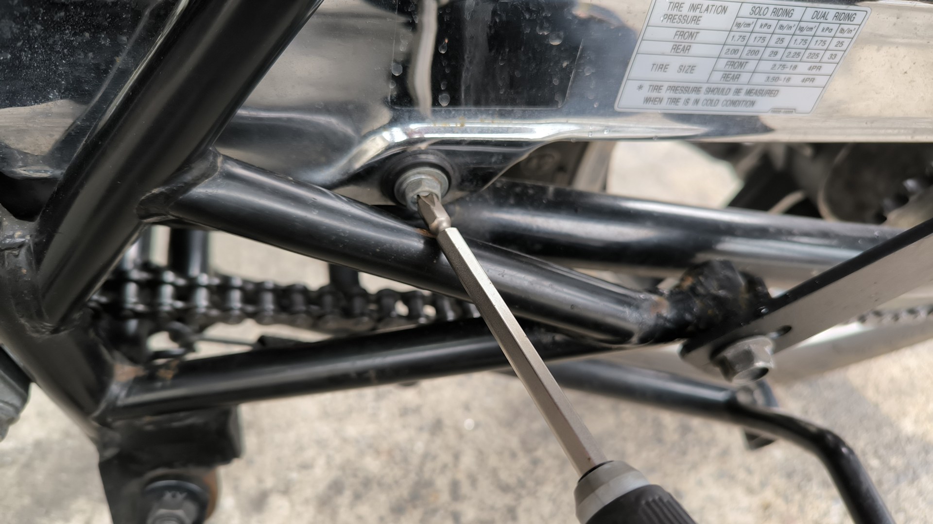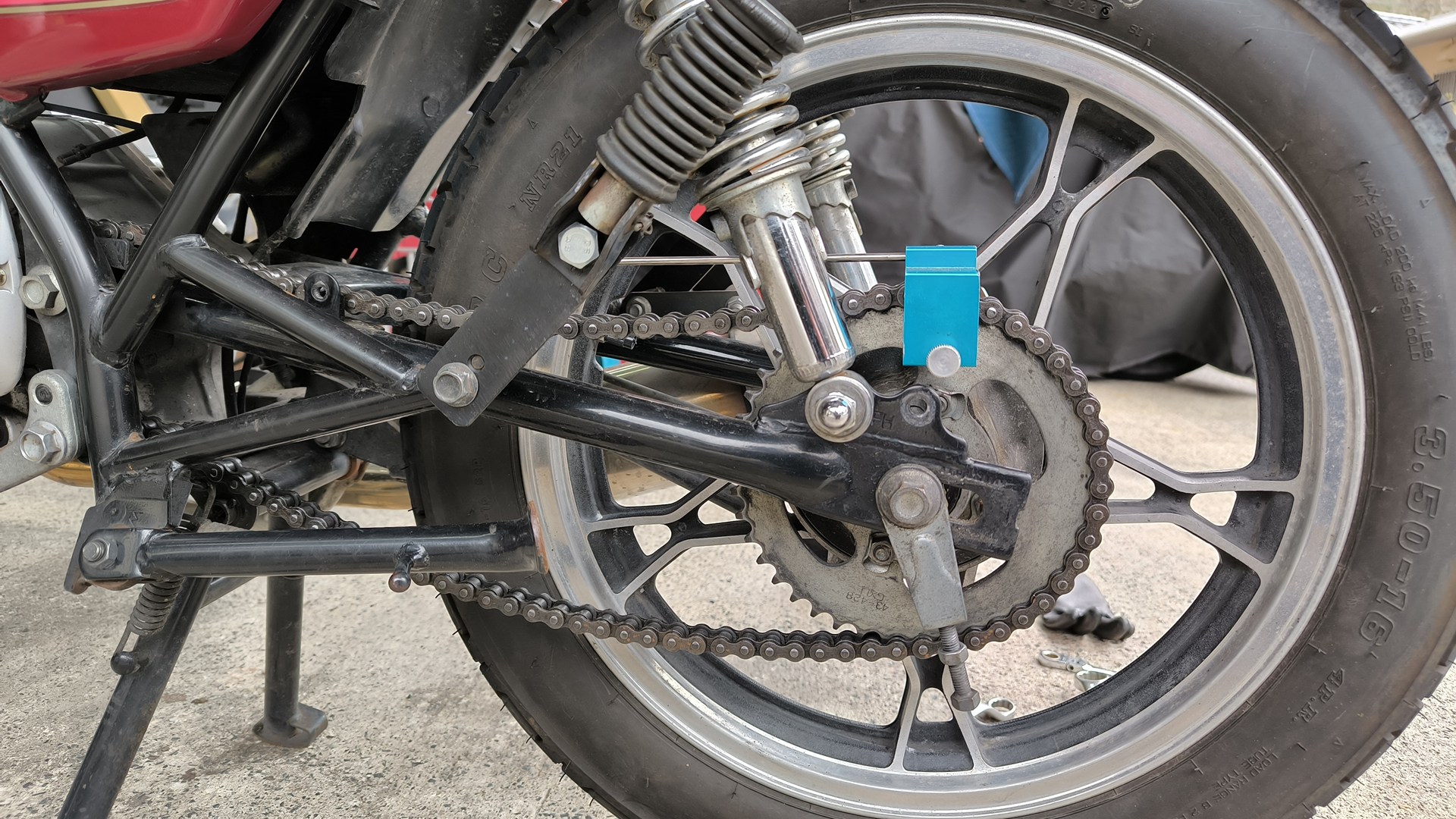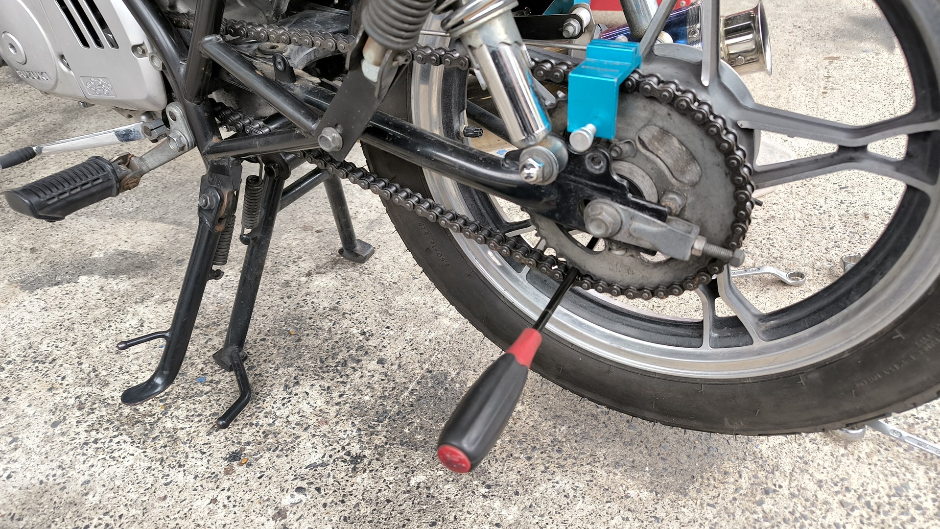 ここでチェーンアライメントツールの登場だ。チェーンの張り調整時には必ず使用するようにしたい。左右にアジャスターには目盛りがあるが、その目盛りを左右同じにしてもチェーンはまっすぐには張れない。おそらくどんなバイクでもそうなっている。チェーンをまっすぐに張ることでフリクションロスが軽減し、GNの場合だと燃費が2km前後伸びるよ!
