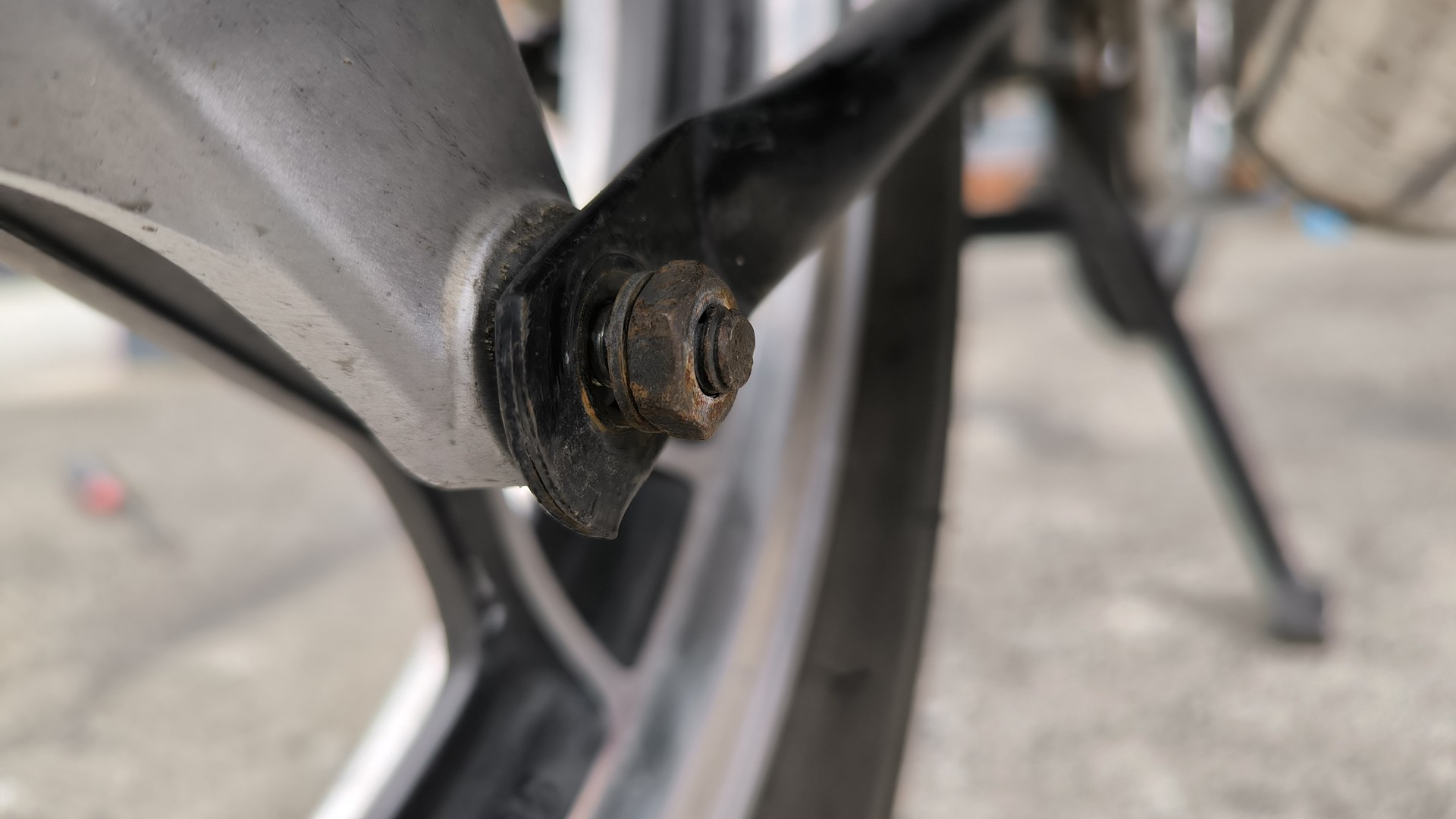 アクスルナットの締め付けトルクは79Nmだ!だがマフラと干渉してトルクレンチは入らないのであか吉ザウルスは手ルクレンチで締め付けている。