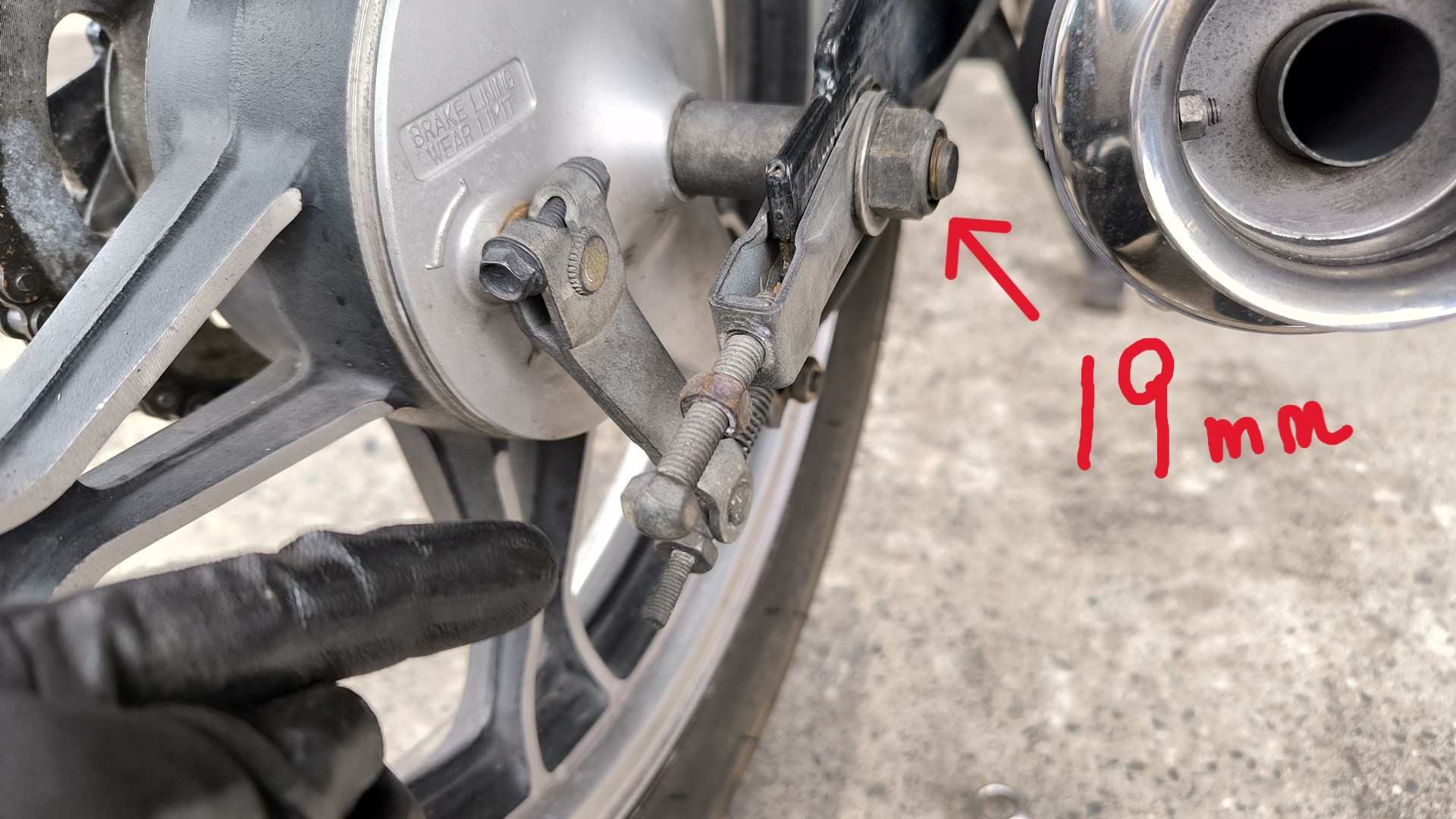 アクスルナット(マフラー側)を緩める。サイズは19mmで反対側のアクスルシャフトの頭は17mmだ。あか吉ザウルスは右利きの為、右手右腕でメガネレンチで押すように緩めている。