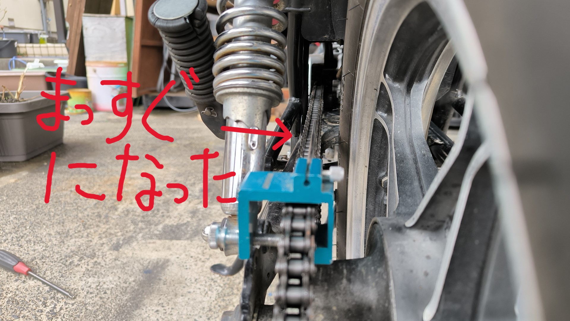 チェーンは想像以上に緩くてもOKだと考えている。バイクに乗ると体重が加わり、スイングアームは『へ』の字状態から『ー』状態になるから、ちょっと緩すぎるかなっという程度でもOKだ!動画は少し張り過ぎかも(;^ω^)