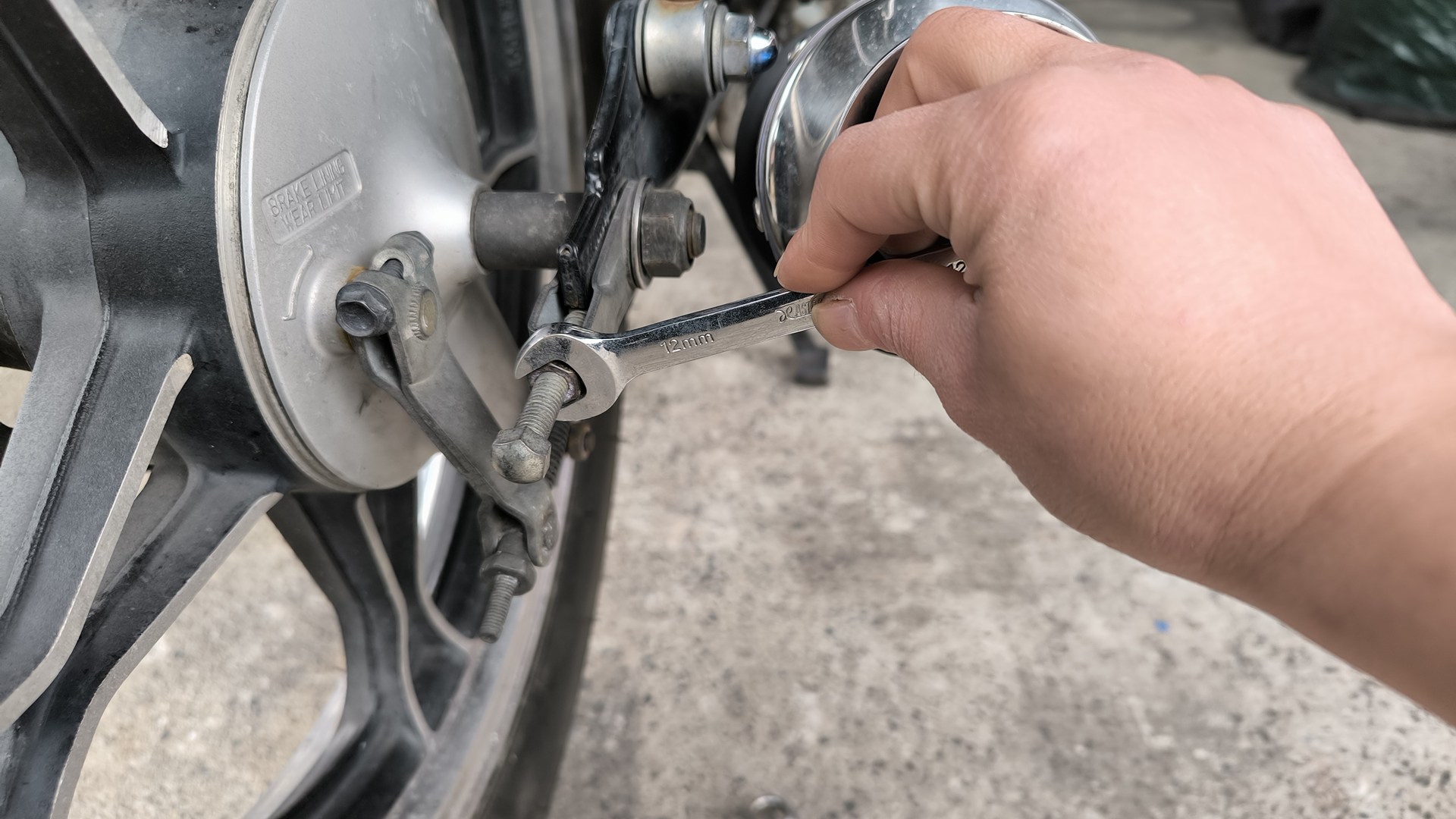 写真はアジャスター固定ナットにスパナをかけているが、左右のボルトの方を回しながらまっすぐに調整する。