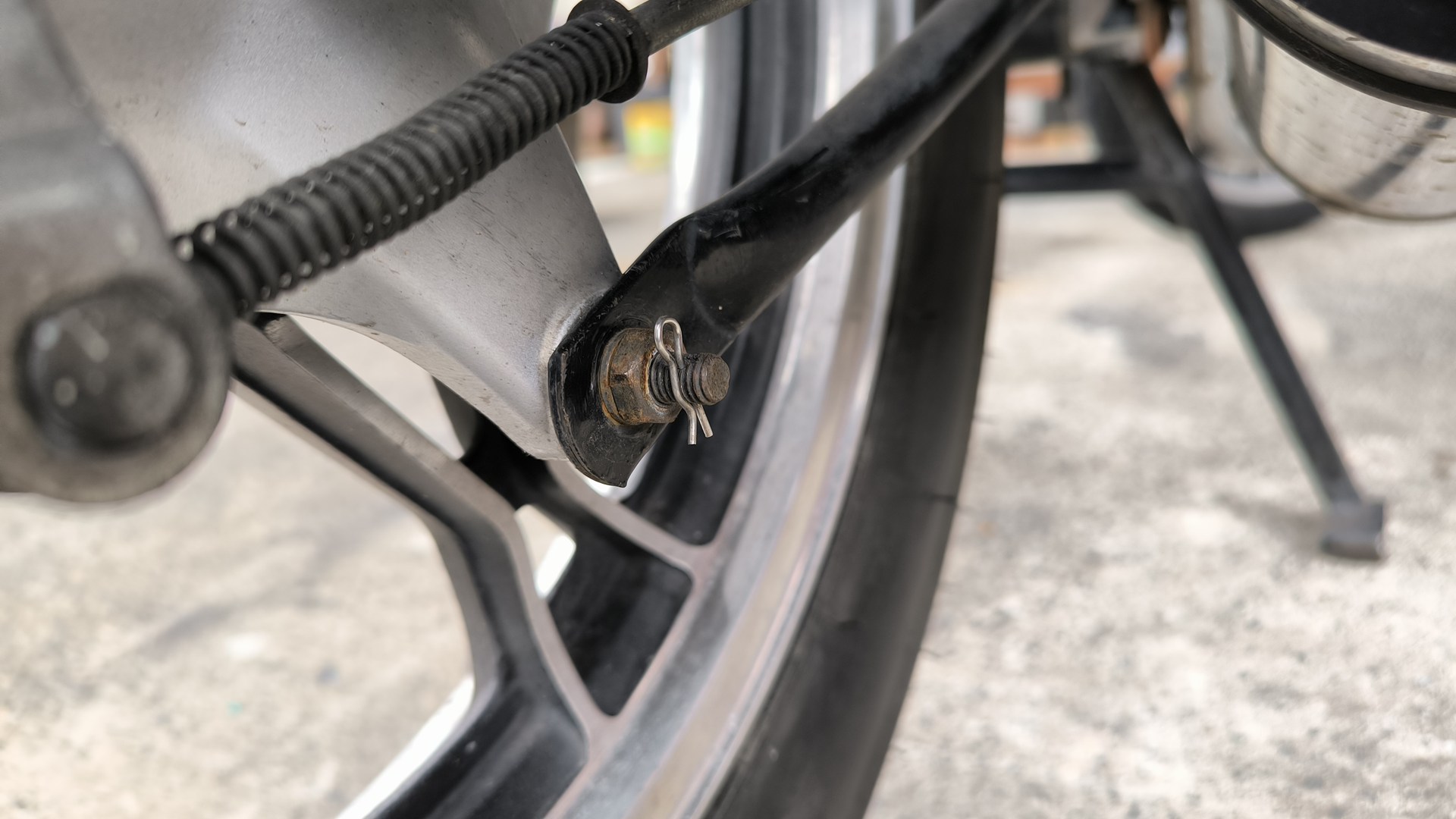 割ピンを外し、14mmナットを緩める。あか吉ザウルスはRピンに変更している。ホムセンで購入したものだ。